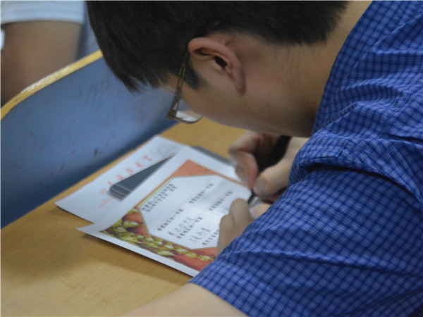 会前,各毕业班辅导员老师都对班会做了精心策划,列出了提纲。系学生会也精心印制了“生涯之盾”卡片,内容包括:用3-5个词概括我的大学生活,我最快乐的一件事,我最自豪的一件事,我最难忘的一件事,我最遗憾的一件事和我对未来的期待等等。同学们热情高涨,仿佛又回到了4年前,纷纷将自己四年来的心得、收获与感悟通过小小的卡片展现出来,其中的酸甜苦辣只有自己才能深刻体会。