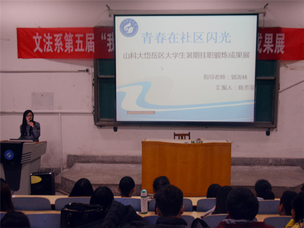 此次成果展共有“古运河 新发展”调研山东实践团队、“新型社区特色产业驱动社区发展模式”调查研究团队、“青春在社区闪光”暑期大学生骨干基层挂职锻炼团队三个队伍参加。 “古运河新发展”调研山东实践团队的主讲人孙欣从主题确定、前期准备、实地调研、成果汇总、实践归来话感受五个方面汇报调研成果。“新型社区特色产业驱动社区发展”调研团的主讲人靳雪妍从前期准备尽完善、互相交流得升华、纸上得来终觉浅、整理资料谈收获这四个方面进行成果汇报。、“青春在社区闪光”暑期大学生基层挂职锻炼团队的主讲人陈芳菲从基层挂职锻炼简介、日常生活和感悟三个方面进行讲述,她详细地讲解了在社区的日常工作及自己的感悟。学生会副主席张国庆作总结讲话,他讲到调研团队的成员应树立强烈的集体意识,群策群力,共同做好选题、联络、撰写调研报告等工作。他呼吁大家踊跃投身到社会实践中去,在实践中长知识,增才干。