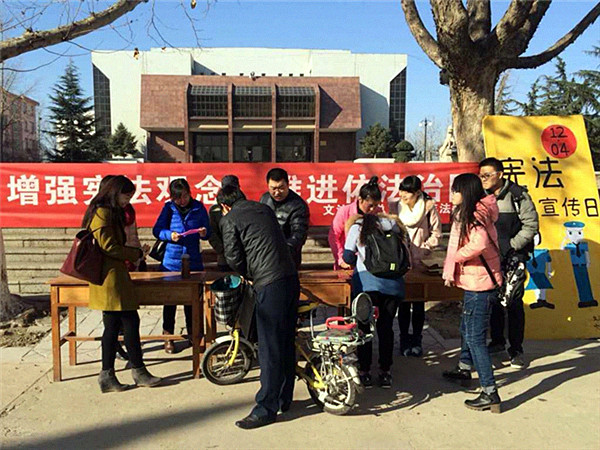 据悉,在十二届全国人大常委会第十一次会议上,国家审议通过了关于设立国家宪法日的决定,明确将12月4日设立为国家宪法日,将通过多种形式开展宪法宣传教育,以此来增强全社会的宪法意识,弘扬宪法精神,全面推进依法治国。文法系积极开展以“增强宪法观念,推进依法治国”为主题的法律宣传活动,制作了宣传展牌、横幅,同时还印发了1000多张宣传单页并在活动地点设立了法律咨询台。活动人员以饱满热情为同学们宣传宪法知识,讲解宪法内容,加深同学们对宪法的认识。法学教研室主任刘辉和王新娟等多位老师亲临活动现场,为在场同学答疑解惑,进行法律指导。