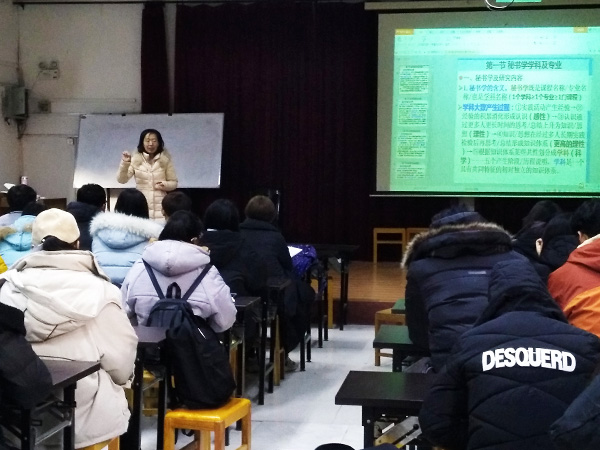 1月5日上午,文法系秘书学17-1班在文秘情景实训室召开考前座谈会,秘书学17-1班全体同学参加,会议由班主任董爱芹主持。