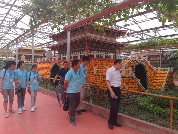 在参观的过程中,苏书记向实践团详细介绍了寿光国际蔬菜博览会的发展历程以及寿光国际蔬菜博览会的举行对寿光市蔬菜经济产业发展的重大推动作用和意义。队员们实地参观了蔬菜博览会1号至8号展厅,展示内容涉及种苗培育、农资、大棚建造设施材料、农产品及蔬菜加工产品、高新技术成果项目和其他与蔬菜相关行业产品。队员们对8号展厅印象最为深刻,8号展厅取名为“奇翠苑”, 门口的“龙舟竞渡”,气势豪放;占地1500多平方米的“绿色王城”,宏伟壮观,让人叹为观止;以中国版图、56个民族大团结及其特征为表现素材的“和谐九州”,,让人禁不住点赞。展厅中,几十个蔬菜小品也被做成了各种各样的蔬菜艺术景观,艺术性、观赏性、文化性兼备,细致地诠释着蔬菜文化的内涵。
