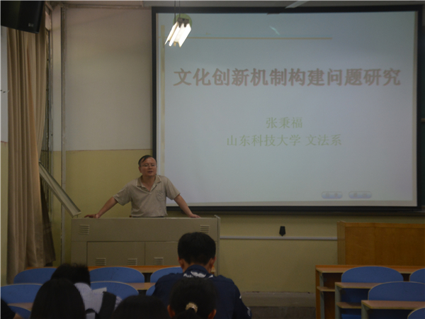顺应时代,全面涉猎,创新机制,稳步发展。此次学术报告会以“文化创新机制构建问题研究”为主题,分为“社会变迁呼唤文化创新”、“文化创新的基本特征”、“文化创新的基本原则”、“文化创新的实现途径”、“全球化条件下我国文化创新机制的构建”五部分内容。张老师首先就前四部分知识结合当今现状做了简要讲解,让大家对文化创新有了全面整体的认知与把握。随后又从“体制、机制与文化创新”、“文化创新机制的主要内容”与“创建文化创新机制应处理好的几个关系”三个方面详细具体的介绍了全球化条件下我国文化创新机制构建的问题,深入解释了现代社会文化创新的有关现象,系统阐释了当今时代的文化创新机构的建设体系。
