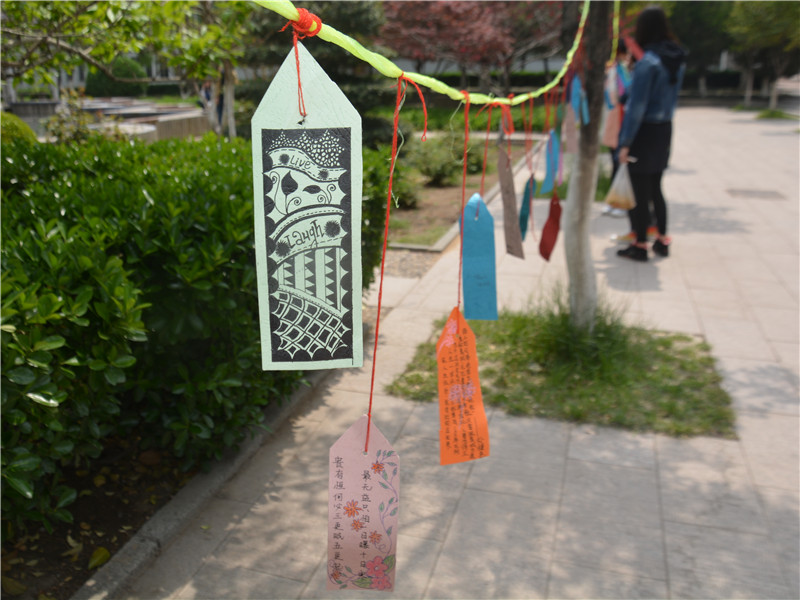 此次比赛以“炫彩青春,靓丽书签”为主题,要求同学们在书签上写上自己在读书中积累的经典美句、名人名言或心灵感悟。从传承文化、贴近生活、与时俱进、校园生活、感悟人生等多方面立意。可以是单幅作品,也可以是成套作品。可以是个人独立创作,也可以是小组集体创作。经过积极宣传后,同学们均展开了自己想像的翅膀,遨游在创意的海洋中,创造出了属于自己心灵的作品。书签的内容积极向上、个性张扬,有的写下“此时不搏,更待何时”的励志话语,有的写上“年轻不需要导航,我信仰心的方向”,传达出90后青春向上的精神风貌;书签的形状多种多样,有叶形、心形、钥匙形,各类卡通动物等等;有的同学还附上了精美的图画和文艺性的装饰。每幅作品设计精巧,制作精美,形式多样,充分展现了同学们的想象力、创造力。后期,组织人员将书签在鹰湖和明谭周围进行了展览,在一片绿树娇艳之间,伴着徐徐春风,美丽的书签在风中飘荡,不仅将经典与感悟在同学们中传递和交流,也亮出了一道多姿多彩的青春风景线。
