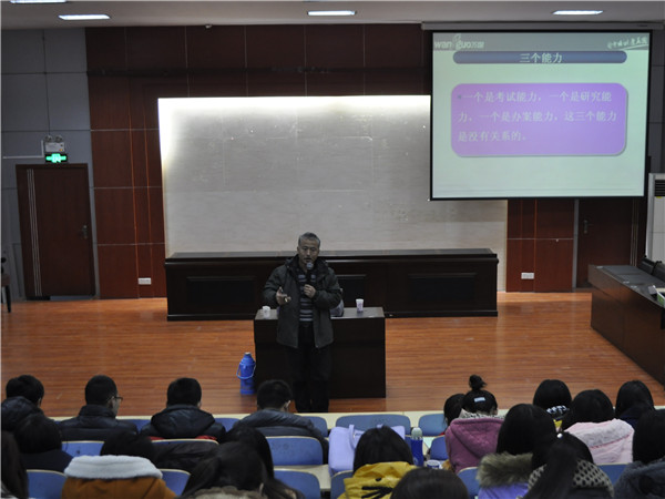 12月1日,文法系在模拟法庭举办“成功在此一搏——司法考试公益讲座”,特邀中国人民大学博士、万国司法考试老师楚文担任主讲,共有130余名法学专业学生参加了此次报告会。