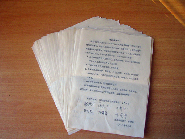 由各辅导员老师主持召开考风考纪教育主题班会,带领大家学习《学生手册》中的考场规则和考试违规认定处理办法等内容,并在讲解过程中还列举了大量具体事例,以引起大家的重视。文法系团总支和学生会还发放了《诚信考试倡议书》,文法系自律会发放了《考试承诺书》,以宿舍为单位由宿舍长带领学习并在承诺书上签字。