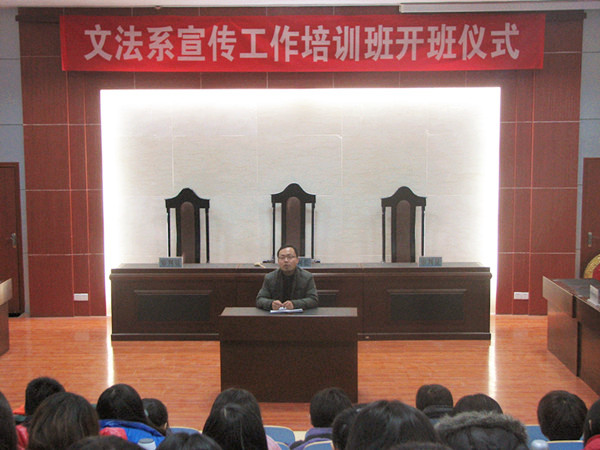 12月13日下午,文法系在模拟法庭举行了学生宣传工作培训班开班仪式。文法系新闻社和学生会宣传部全体成员、各团支部书记和宣传委员参加了会议。