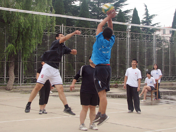 夏雨刚息,排球场干净清凉,很适合运动。此次比赛由教师队对抗学生队,大家各就各位,比赛开始了。这学期,经过师生排球赛的锻炼,大家都积累了丰富的“战斗”经验,两支队伍都剑拔弩张,队友间配合默契,双方实力不相上下。学生队年轻气盛,动作敏健,气势逼人;教师队则沉着稳重,以智取胜,步步为营。面对学生队的大力扣杀和完美发球,教师队加强防守、以柔胜刚。终于,一番激烈的较量后,教师队大获全胜,让学生队心悦诚服。