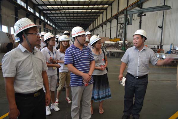 在座谈期间,文法系师生详细了解了企业的毕业生需求情况,接着观看了企业的宣传片。随后同学们戴上安全帽跟随冯主任走进了生产车间,高温作业的车间里机器轰鸣作响,工人们在生产线上熟练地操作。冯主任说:“ 公司现有4条铝箔生产线、5条铸轧生产线、1条冷轧生产线和1条铝箔涂层生产线,还多次从外国引进先进的数控系统;我们的生产队伍也都是高素质的技术人才,也欢迎文法系的同学们来到我们鲁丰铝箔。”