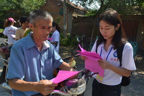 在农贸市场门口,三下乡实践团的队员们拉起了横幅,向过往群众们发放法律宣传材料,宣讲法律常识。为村民发放的宣传册主要围绕农村土地使用权、外出务工人员的土地所有权以及留守妇女儿童的权益保护等问题。在前来咨询的村民中,一位年近七旬的老人引起了同学们的注意,记者了解到,老人的子女全都在外打工,只有她一个人照顾孙女的起居生活,暑假过完孙女即将高中入学,老人听说当地允许办理助学贷款,但不知道具体的手续办理流程,故向同学们进行询问。最终通过同学们的耐心解答和指导,老人得到了满意的答复。